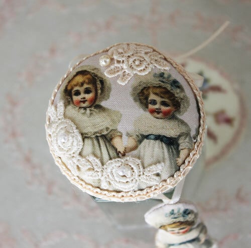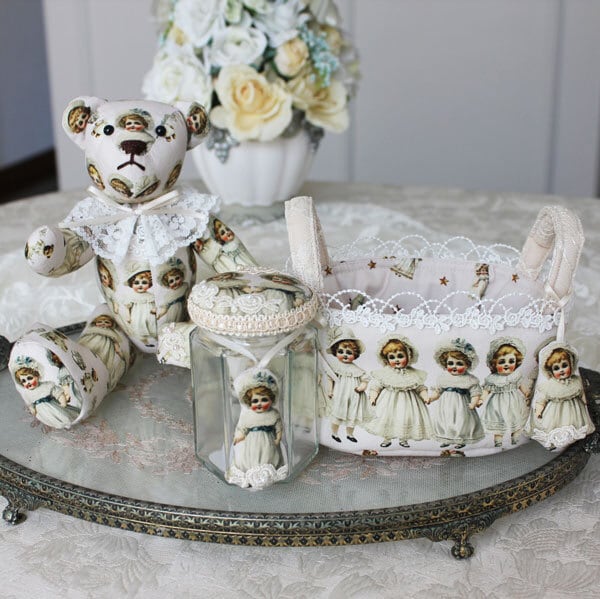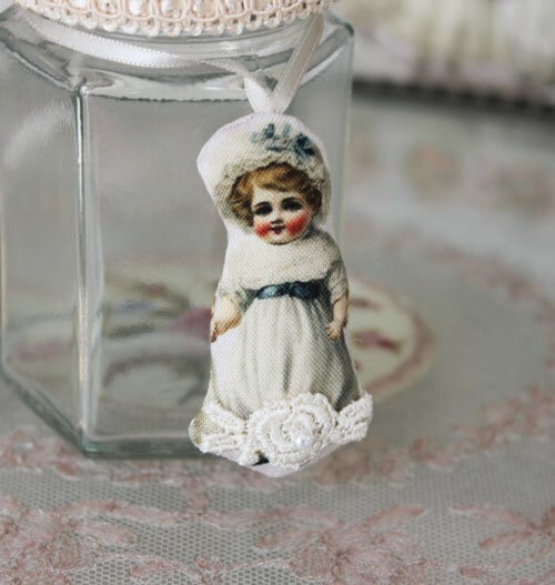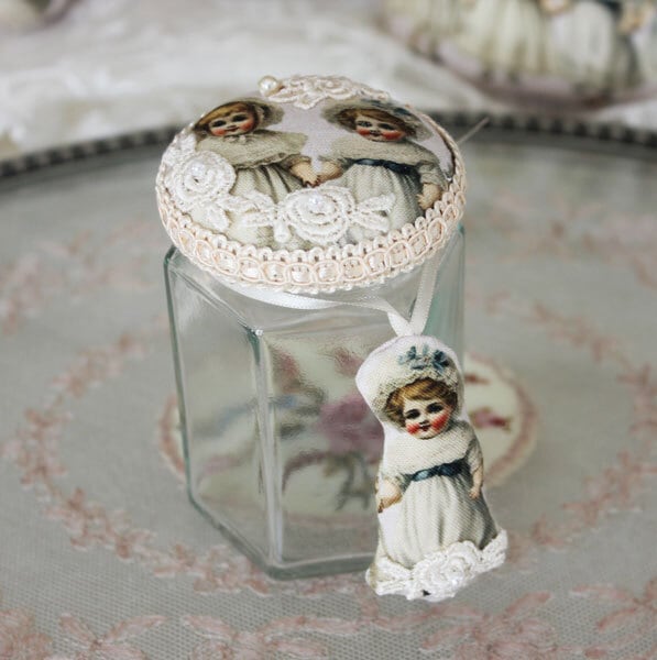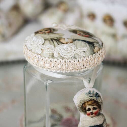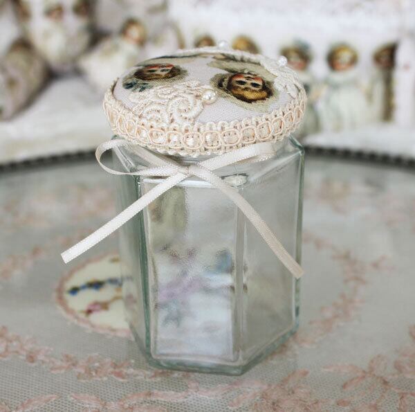 ドール柄の生地を瓶の蓋に配し、