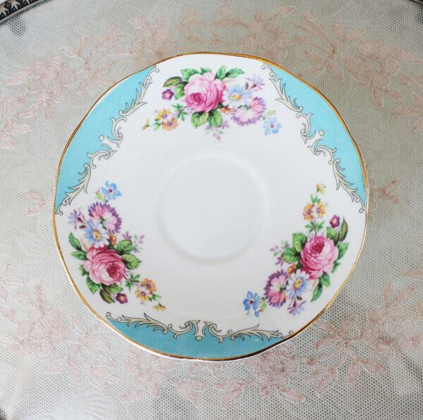 ソーサーとプレートはピンクの薔薇のブーケに